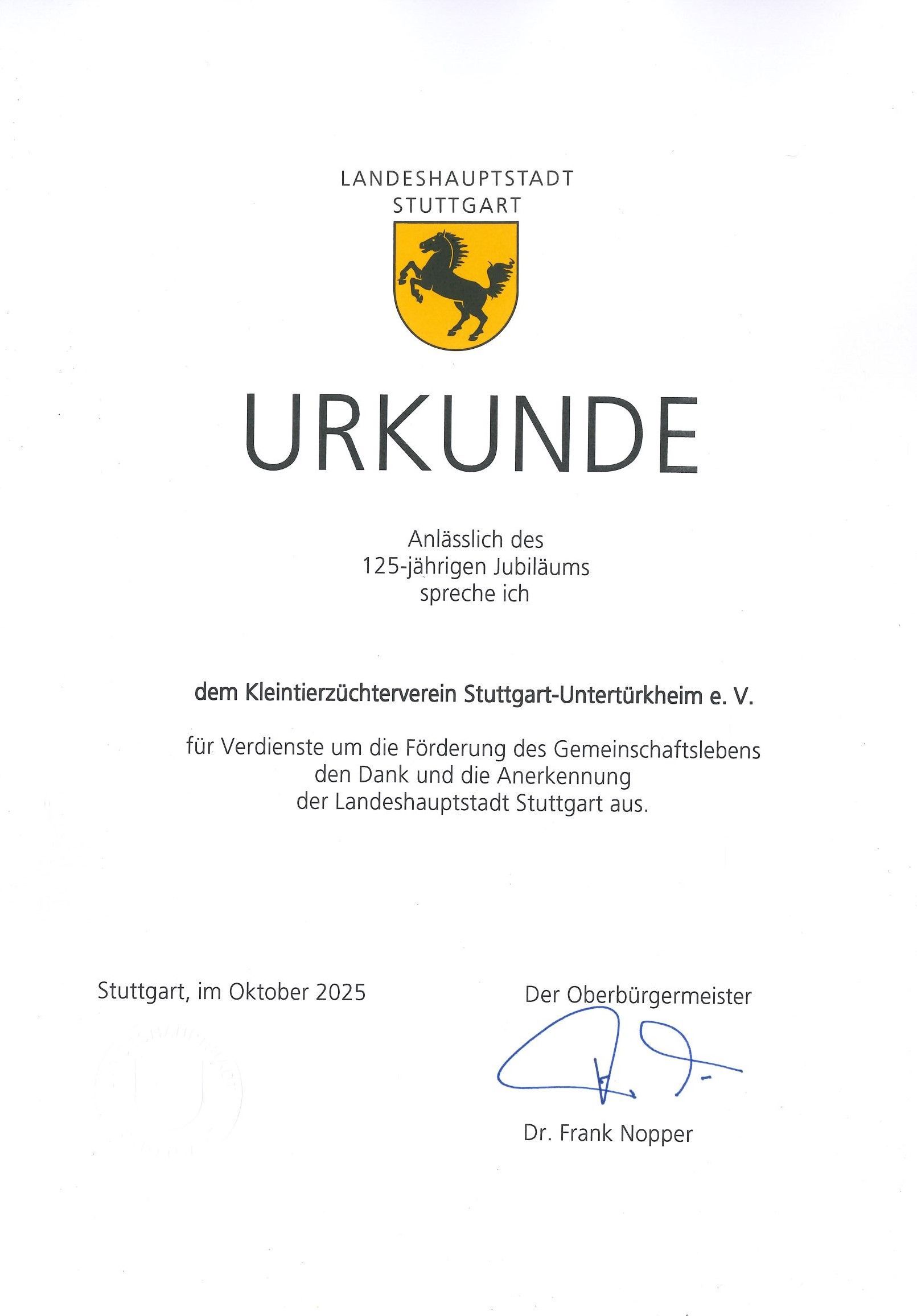 Anlässlich zu unserem 125-jährigem Jubiläum haben wir von der Stadt Stuttgart eine Urkunde bekommen!